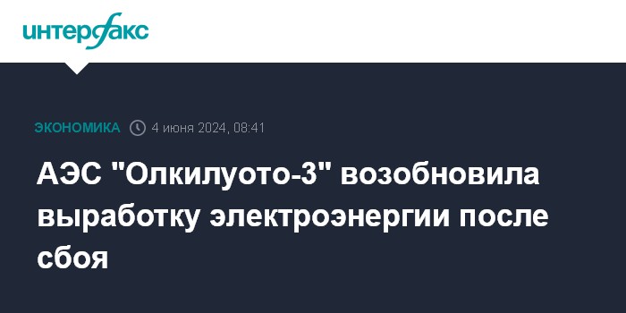 Москва. 4 июня. INTERFAX.RU - В Финляндии возобновлено производство электроэнергии на АЭС "Олкилуото-3", прерванное 3 июня из-за отказа турбины.