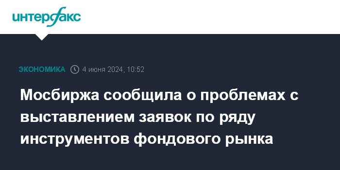 Москва. 4 июня. INTERFAX.RU - По ряду инструментов на фондовом рынке в настоящее время могут наблюдаться проблемы с выставлением заявок, говорится в сообщении "Московской биржи".