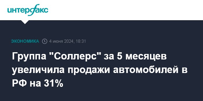 Москва. 4 июня. INTERFAX.RU - Продажи российской автомобилестроительной группы "Соллерс" на внутреннем рынке за 5 месяцев 2024 года выросли на 31,1% до 18,632 тыс. штук.