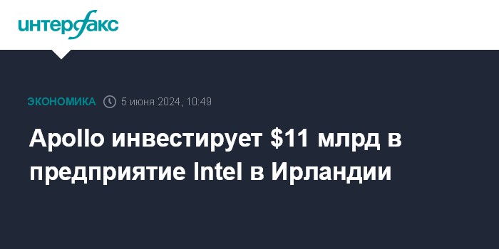Москва. 5 июня. INTERFAX.RU - Apollo Global Management инвестирует $11 млрд в предприятие Intel Corp. по выпуску чипов в Ирландии, сообщила lntel. Apollo получит 49% в этом проекте, а Intel сохранит за собой 51%-ную долю.