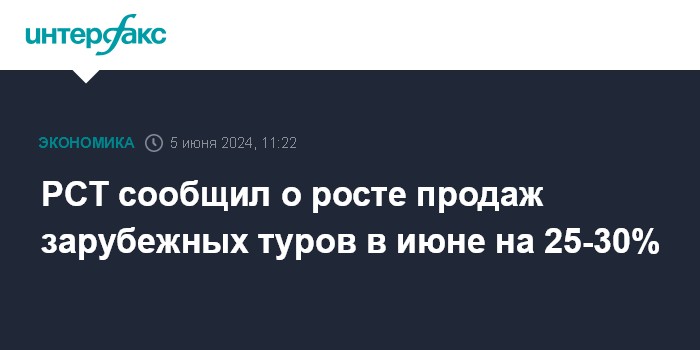 Москва. 5 июня. INTERFAX.RU - В июне 2024 года объем бронирований туров за рубеж вырос на 25-30% в годовом исчислении, больше половины продаж приходится на Турцию, сообщил Российский союз туриндустрии.