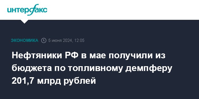 Москва. 5 июня. INTERFAX.RU - Выплаты из российского бюджета нефтяным компаниям по топливному демпферу в мае 2024 года составили 201,7 млрд рублей, сообщается в материалах о формировании и использовании дополнительных нефтегазовых доходов федерального бюджета, размещенных на сайте Минфина.