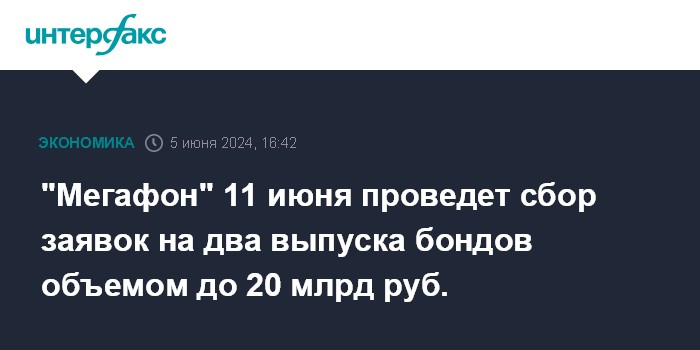 "Мегафон" 11 июня проведет сбор заявок на два выпуска бондов объемом до 20 млрд руб.