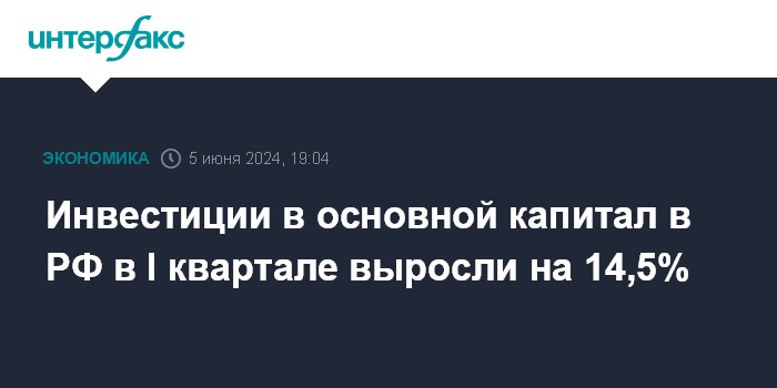 Москва. 5 июня. INTERFAX.RU - Инвестиции в основной капитал в РФ в I квартале 2024 года выросли на 14,5% в годовом выражении, сообщил в среду Росстат.