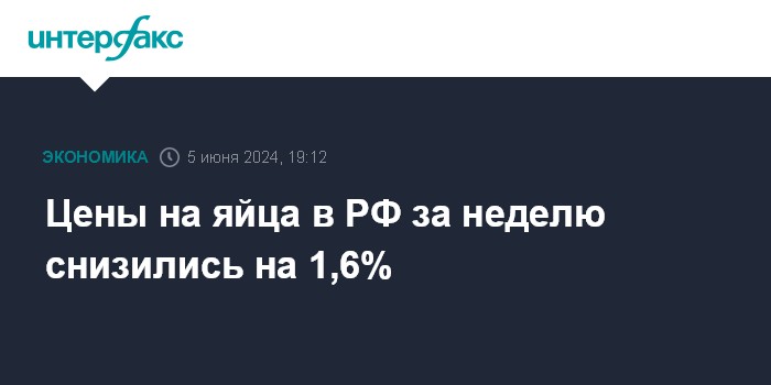 Москва. 5 июня. INTERFAX.RU - Цены на яйца в РФ с 28 мая по 3 июня снизились на 1,6%, сообщил Росстат в среду.