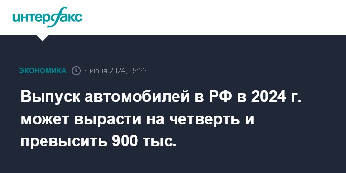 Москва. 6 июня. INTERFAX.RU - Текущая динамика показателей в автомобильной промышленности позволяет повысить ожидания по объёму производства автомобилей всех категорий в 2024 году в РФ до более чем 900 тыс. с зафиксированных в отраслевой стратегии 839 тыс., сообщил в интервью "Интерфаксу" первый вице-премьер РФ Денис Мантуров.