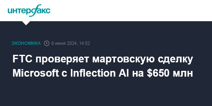 Москва. 6 июня. INTERFAX.RU - Федеральная торговая комиссия США (Federal Trade Commission, FTC) начала расследование сделки Microsoft Corp. с ИИ-стартапом Inflection AI на $650 млн, пишет The Wall Street Journal со ссылкой на информированный источник.