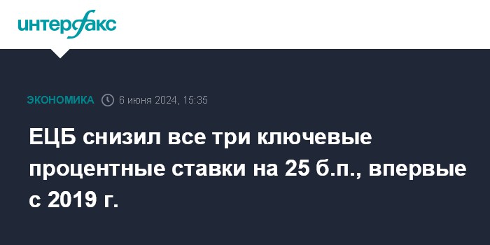 Москва. 6 июня. INTERFAX.RU - Европейский центральный банк (ЕЦБ) снизил все три ключевые процентные ставки на 25 базисных пунктов (б.п.) по итогам заседания в четверг.