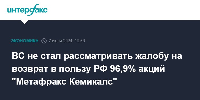 Москва. 7 июня. INTERFAX.RU - Верховный суд РФ не будет рассматривать кассационную жалобу АО "Метахолдинг" по делу о возврате в пользу РФ 96,9% акций "Метафракс Кемикалс", сообщается в картотеке арбитражных дел.