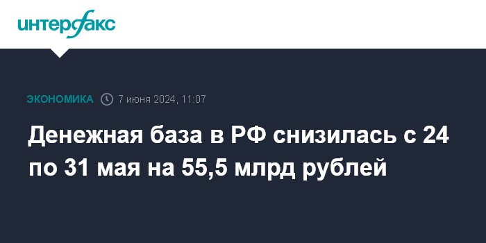 На 24 мая денежная база в России равнялась 18 199,2 млрд рублей. Таким образом, за период она снизилась на 0,31%, или на 55,5 млрд рублей.