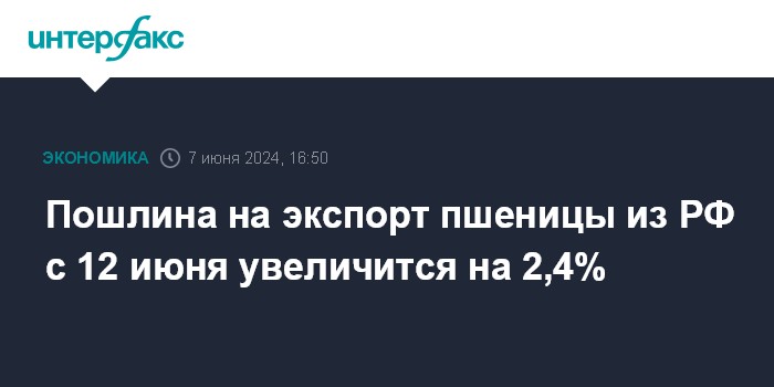 Пошлина на экспорт пшеницы из РФ с 12 июня увеличится на 2,4%