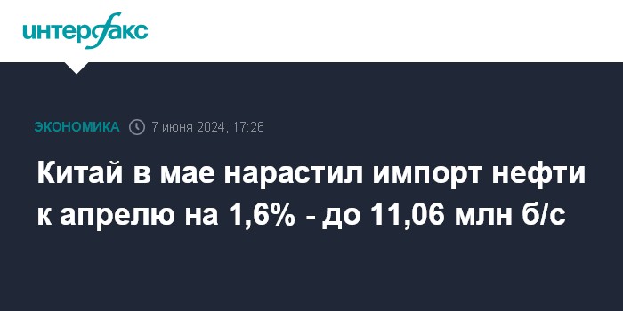 Москва. 7 июня. INTERFAX.RU - Среднесуточный объем импорта нефти Китаем в мае вырос к апрелю на 1,6% - с 10,882 млн б/с до 11,06 млн б/с, свидетельствуют расчеты "Интерфакса" на основе данных Главного таможенного управления КНР.