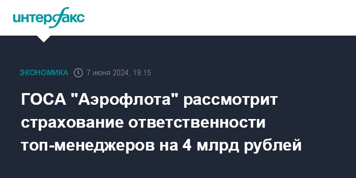 ГОСА "Аэрофлота" рассмотрит страхование ответственности топ-менеджеров на 4 млрд рублей
