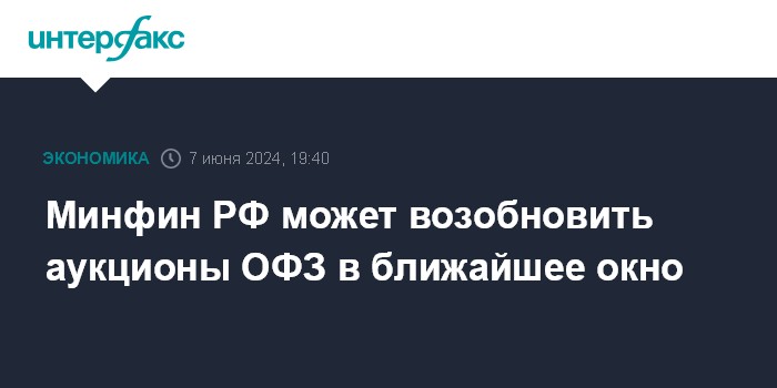Москва. 7 июня. INTERFAX.RU - Минфин РФ может возобновить проведение аукционов по размещению облигаций федерального займа (ОФЗ) в ближайшее время.