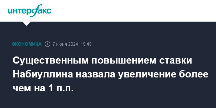Москва. 7 июня. INTERFAX.RU - Существенным повышением ключевой ставки Банка России является ее увеличение шагом более чем в 1 процентный пункт, сообщила на пресс-конференции председатель ЦБ Эльвира Набиуллина.