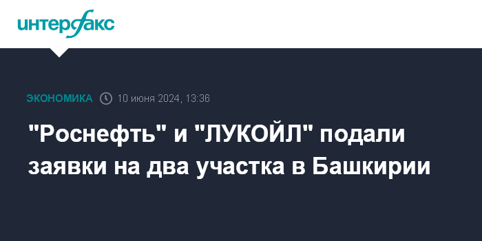 Москва. 10 июня. INTERFAX.RU - "Роснефть" и "Российская инновационная топливно-энергетическая компания" (РИТЭК, Самара, контролируется "ЛУКОЙЛом") подали заявки на участие в аукционах на право геологического изучения, разведки и добычи углеводородов на Межгорном и Чургульдинском участках в Башкортостане, сообщили "Интерфаксу" в Минприроды.