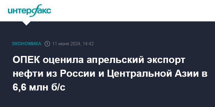 Москва. 11 июня. INTERFAX.RU - Общий объем экспорта нефти из России и стран Центральной Азии в апреле составил в среднем 6,6 млн баррелей в сутки, что соответствует объемам, поставленным в марте, говорится в ежемесячном отчете ОПЕК.