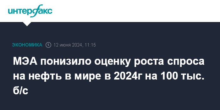 МЭА понизило оценку роста спроса на нефть в мире в 2024г на 100 тыс. б/с