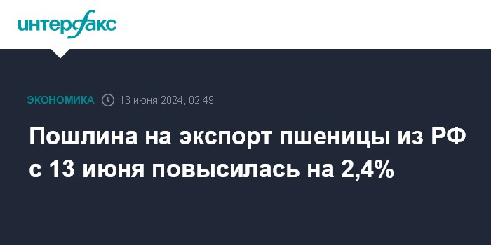 Пошлина на экспорт пшеницы из РФ с 13 июня повысилась на 2,4%