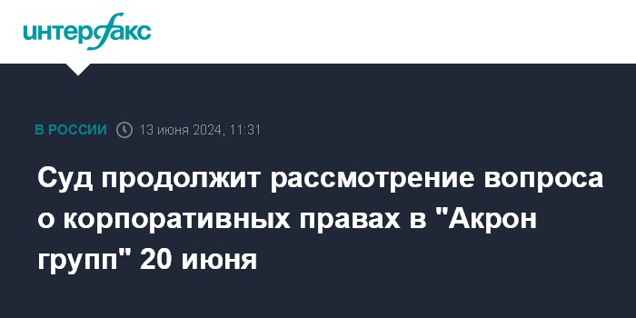 Суд продолжит рассмотрение вопроса о корпоративных правах в "Акрон групп" 20 июня