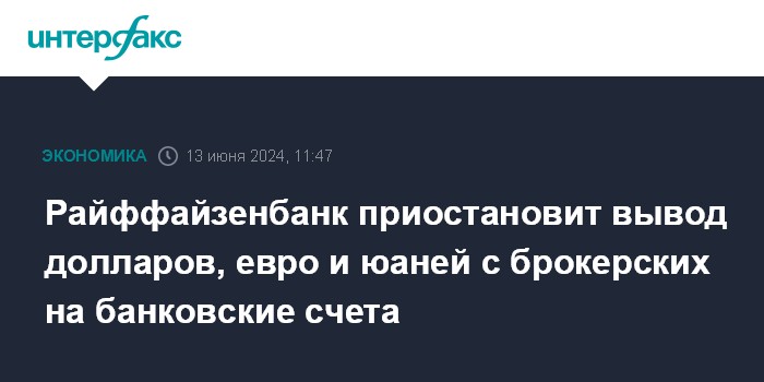 Москва. 13 июня. INTERFAX.RU - Райффайзенбанк сообщил, что приостанавливает вывод долларов, евро и юаней с брокерских на банковские счета до появления разъяснений от "Мосбиржи".