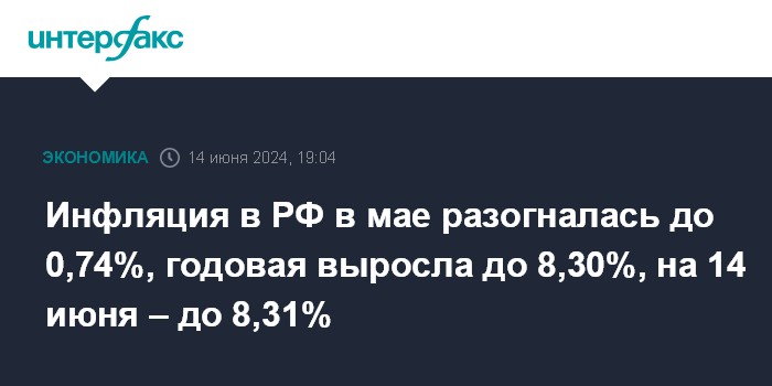 Инфляция в РФ в мае разогналась до 0,74%, годовая выросла до 8,30%, на 14 июня – до 8,31%