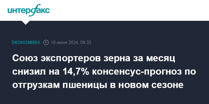Москва. 15 июня. INTERFAX.RU - Российский союз экспортеров зерна, начавший 17 мая публикацию консенсус-прогнозов по сбору зерна в этом году и экспорту в новом сезоне (начнется 1 июля 2024 года), к 14 июня снизил оценку экспорта пшеницы на 14,7%.