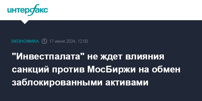 Москва. 17 июня. INTERFAX.RU - "Инвестиционная палата", назначенная организатором обмена заблокированных активов, не ожидает существенного влияния от санкций против Московской биржи на выкуп нерезидентами иностранных бумаг российских инвесторов, сообщили в пресс-службе брокерской компании.