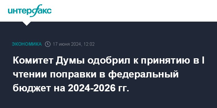 Москва. 17 июня. INTERFAX.RU - Комитет Госдумы по бюджету и налогам на заседании в понедельник рекомендовал принять в первом чтении поправки в бюджет РФ на 2024-2026 гг.