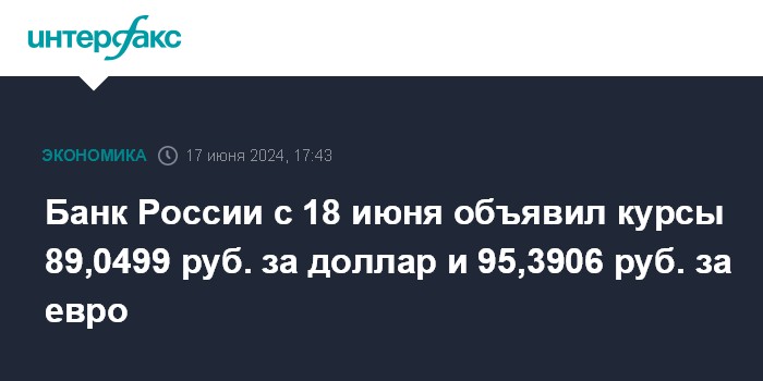 Банк России с 18 июня объявил курсы 89,0499 руб. за доллар и 95,3906 руб. за евро