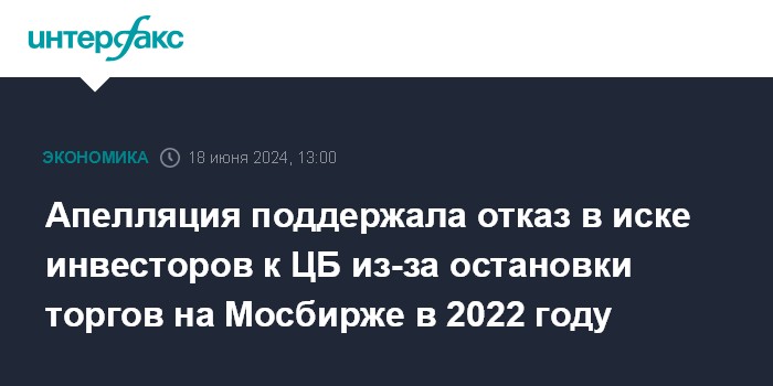 Москва. 18 июня. INTERFAX.RU - Девятый арбитражный апелляционный суд во вторник оставил в силе решение Арбитражного суда Москвы, который 25 марта отклонил иск частных инвесторов к ЦБ РФ о признании недействительными предписаний на остановку торгов на "Московской бирже" в 07:52 (по московскому времени) 24 февраля 2022 года и на возобновление торгов в 09:50, а также о признании незаконным бездействия.