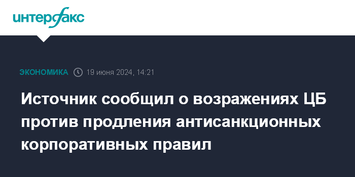Москва. 19 июня. INTERFAX.RU - Банк России не поддерживает очередную пролонгацию специальных корпоративных правил, которые вводились в 2022 году как антикризисные меры в ответ на внешние угрозы. Об этом сообщил источник "Интерфакса", знакомый с позицией регулятора.