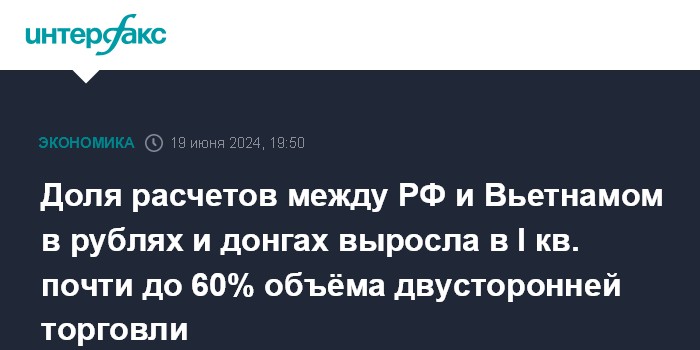 Москва. 19 июня. INTERFAX.RU - Доля расчетов между Россией и Вьетнамом в национальных валютах - российских рублях и вьетнамских донгах в первом квартале 2024 года выросла почти до 60% объёма двусторонней торговли. Об этом сообщается в статье президента Владимира Путина, опубликованной газетой ЦК Компартии Вьетнама "Нянзан".