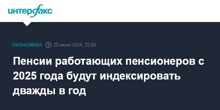 Москва. 20 июня. INTERFAX.RU - Пенсии работающих пенсионеров будут индексироваться по тем же правилам, что и для неработающих; предусмотрена индексация дважды в год, начиная с 2025 года, сообщил министр труда и социальной защиты РФ Антон Котяков.