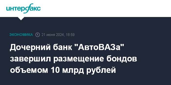Дочерний банк "АвтоВАЗа" завершил размещение бондов объемом 10 млрд рублей