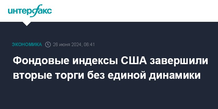 Москва. 26 июня. INTERFAX.RU - Американские фондовые индексы завершили вторые торги подряд без единой динамики, при этом Dow Jones Industrial Average снизился на максимальную величину в текущем месяце, потеряв 0,8%.