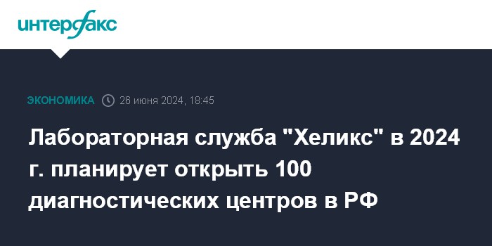 Москва. 26 июня. INTERFAX.RU - Лабораторная служба "Хеликс" (ООО "НПФ Хеликс", Петербург) в 2024 году планирует открыть не менее 100 диагностических центров в России. Об этом сообщила "Интерфаксу" замгендиректора "Хеликс" Дарья Горякина.