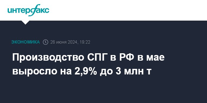 Москва. 26 июня. INTERFAX.RU - Производство крупнотоннажного сжиженного природного газа в России в мае 2024 года выросло по сравнению с прошлогодним показателем на 2,9% до 3,0 млн тонн, сообщил Росстат. Статистическое ведомство округляет данные до одного знака после запятой.