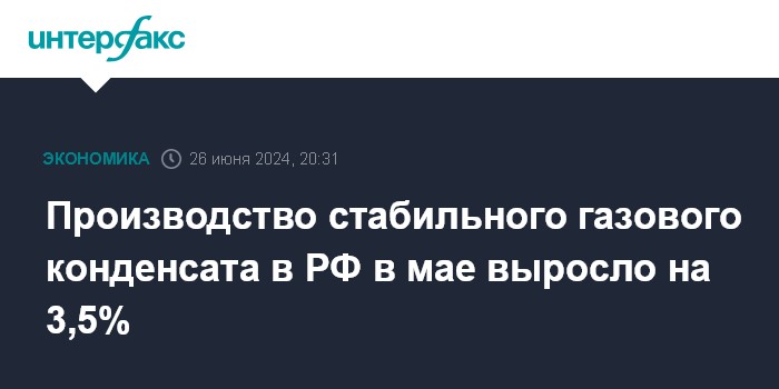 Москва. 26 июня. INTERFAX.RU - Производство стабильного газового конденсата в России в мае 2024 года составило 2,5 млн т, что на 3,5% больше, чем в мае 2023 года, сообщил Росстат.