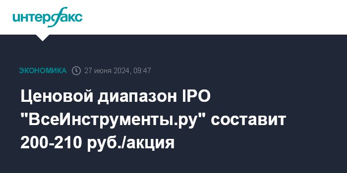Москва. 27 июня. INTERFAX.RU - ПАО "ВИ.Ру" ("ВсеИнструменты.ру") установило ценовой диапазон в рамках IPO на уровне 200-210 рублей за акцию, сообщила компания.