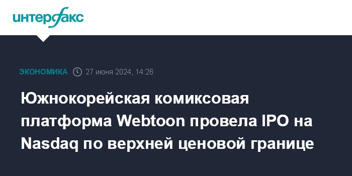 Москва. 27 июня. INTERFAX.RU - Онлайн-платформа комиксов Webtoon Entertainment, контролируемая южнокорейской поисковой системой Naver, провела первичное размещение акций на американской бирже Nasdaq по верхней ценовой границе.