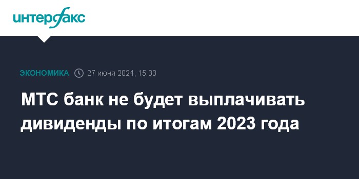 Москва. 27 июня. INTERFAX.RU - Годовое собрание акционеров МТС банка приняло решение не выплачивать дивиденды по итогам 2023 года, свидетельствуют материалы кредитной организации.