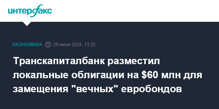 Москва. 28 июня. INTERFAX.RU - Транскапиталбанк разместил локальные облигации на $60 млн в рамках замещения бессрочных субординированных евробондов, сообщила кредитная организация.