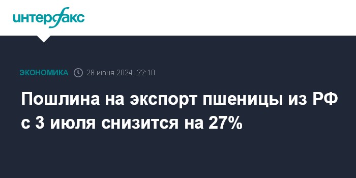 Пошлина на экспорт пшеницы из РФ с 3 июля снизится на 27%