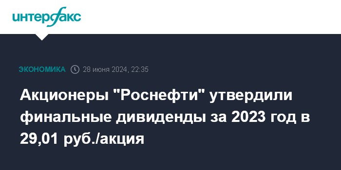 Москва. 28 июня. INTERFAX.RU - Акционеры крупнейшей российской нефтяной компании "Роснефть" на годовом собрании 28 июня в заочной форме утвердили финальные дивиденды за 2023 год в размере 29,01 рубля на акцию, сообщила НК.