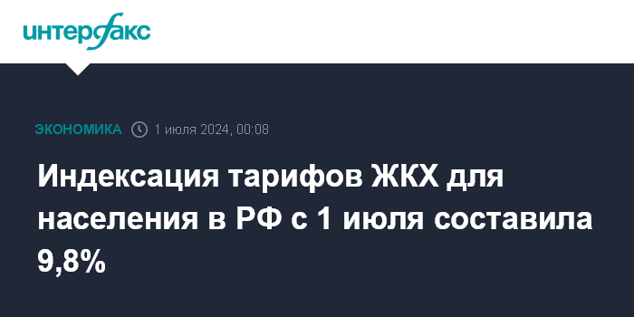 Москва. 1 июля. INTERFAX.RU - Совокупный платеж граждан за жилищно-коммунальные услуги в РФ с 1 июля 2024 года будет проиндексирован в среднем по стране на 9,8%. Такие параметры заложены в утвержденном правительством прогнозе социально-экономического развития РФ на трехлетнюю перспективу и сохранены в уточненном в апреле макропрогнозе до 2027 года.