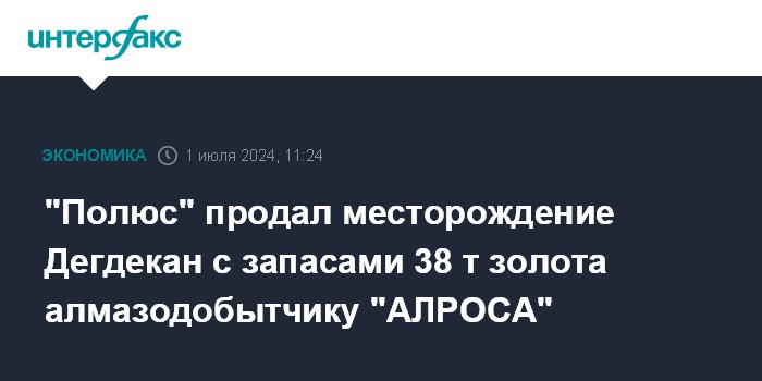 Москва. 1 июля. INTERFAX.RU - "Полюс" продал золоторудное месторождение Дегдеканское рудное поле в Магаданской области алмазодобытчику "АЛРОСА".