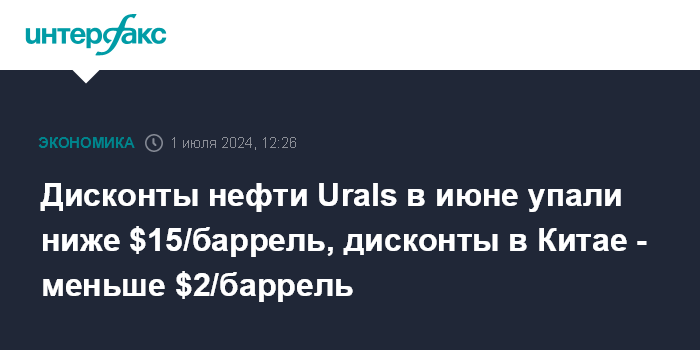 Дисконты нефти Urals в июне упали ниже $15/баррель, дисконты в Китае - меньше $2/баррель