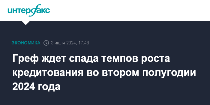 Москва. 3 июля. INTERFAX.RU - Кредитование продолжает расти выше прогнозов, торможение может произойти во втором полугодии, сообщил журналистам в кулуарах финансового конгресса Банка России президент - председатель правления Сбербанка Герман Греф.