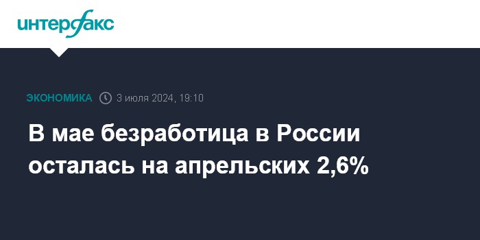 Москва. 3 июля. INTERFAX.RU - В России в мае 2024 года безработица составила 2,6%, оставшись на достигнутом в апреле историческом минимуме (за весь период наблюдений показателя с 1991 года), следует из данных Росстата.